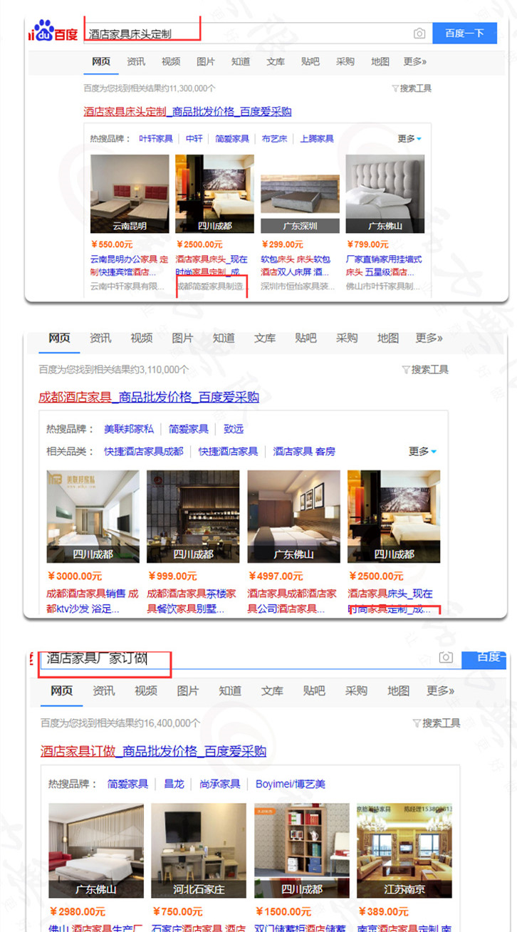 在關(guān)鍵詞搜索中,成都簡愛家居制造有限公司的“酒店家居床頭定制”,排在第二位;“成都酒店家具”排在第四位。