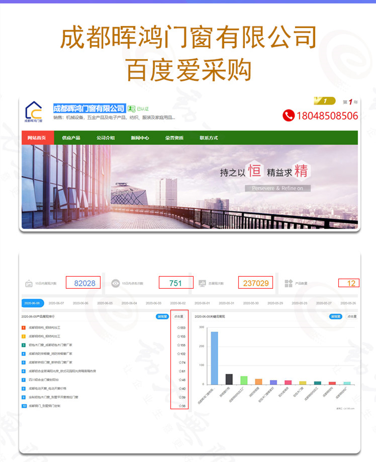 成都暉鴻門窗有限公司,這一個月以來,百度愛采購的總展現(xiàn)次數(shù)為237029次,近15天內(nèi),曝光度高達82028次,點擊數(shù)達到751次。