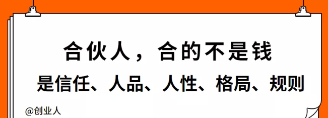 合伙人,合的不是錢,而是信任、人品、人性、格局和規(guī)則。創(chuàng)業(yè),本就是九死一生,不要看到喬布斯、馬云、馬化騰、雷軍等等,就以為創(chuàng)業(yè)是“九生一死”,在這一個個成功光環(huán)被無限放大的背后,是眾多大街小巷、寫字樓里,每天都在破產(chǎn)、倒閉、失敗、痛苦,甚至絕望的人。