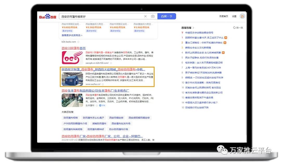 >>>B2B商盟:銅川篷布價位、榆林防曬篷布等關鍵詞均在360搜索引擎平臺首頁展現。